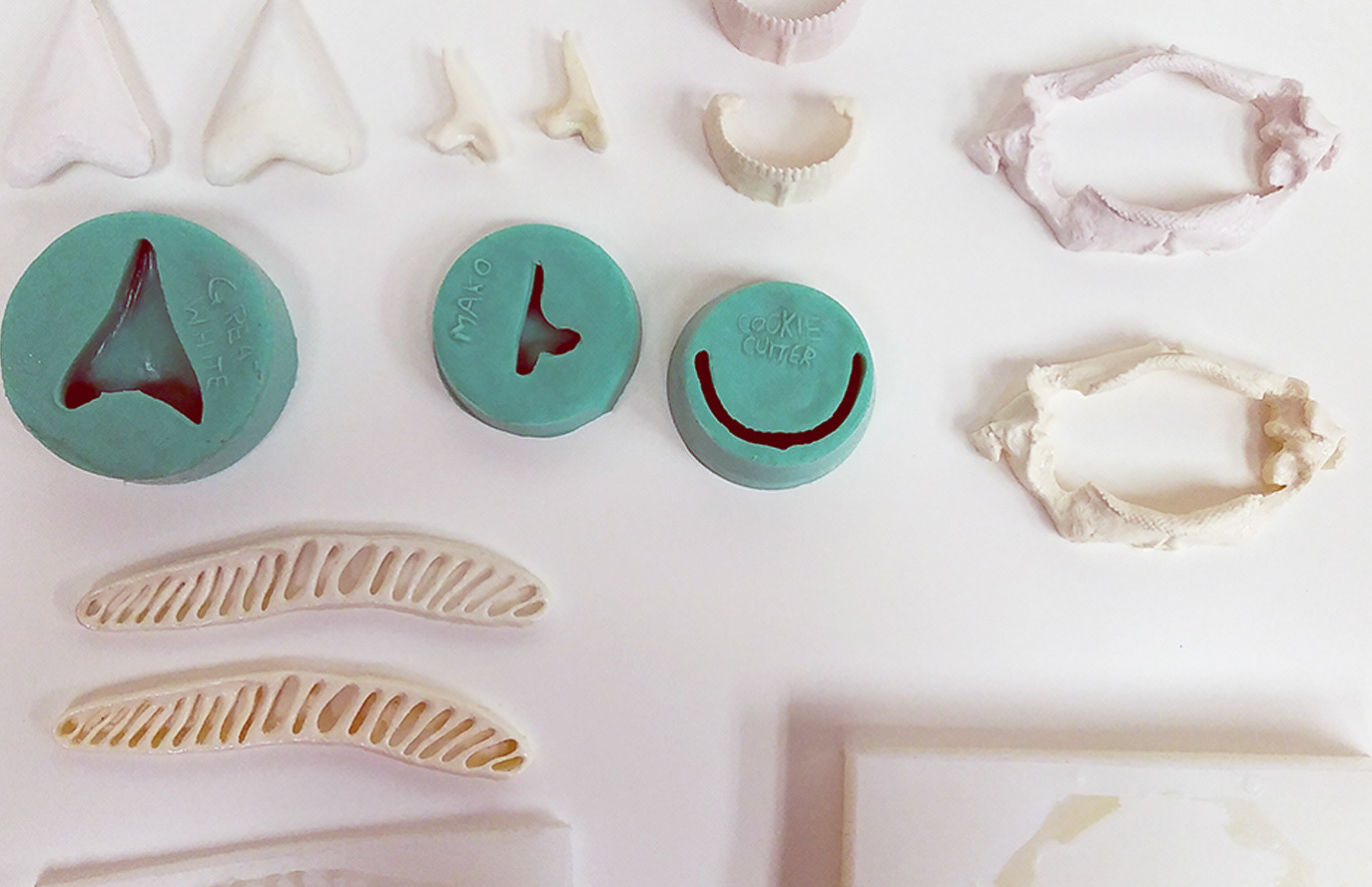 Shark Teeth Molds and Casts; silicone, casting resin, 3D printing filament; 2023; Various, between 2” x 1” and 3” x 5”